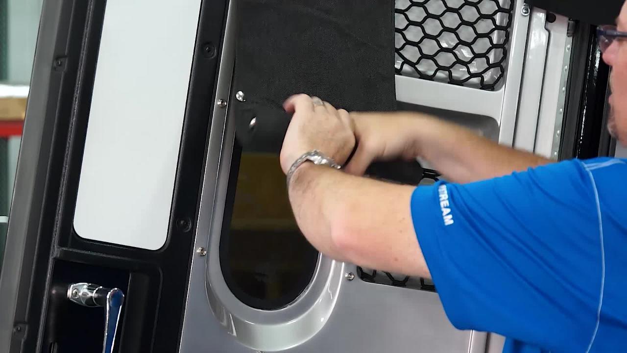 Watch how to use the rear cargo door shades on the Airstream Basecamp with the door closed or open.