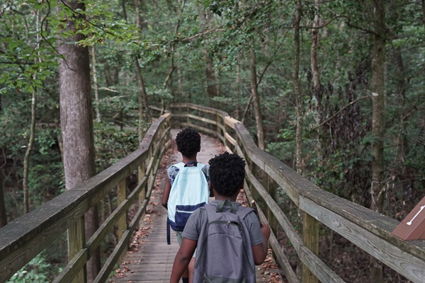 There was compromise involved in our time at Congaree National Park, as well. In order to see the gorgeous, ancient trees, there were obstacles to overcome. We started out with an early morning hike to avoid the hottest part of the day but what we didn't realize was that there were going to be hundreds of large golden orb spiders lurking above our heads and through the branches. It’s that time of year, the ranger said, but he assured us they were harmless. (Some of us in this family has an aversion to bugs—you should have seen our faces as we stared wide-eyed to avoid the huge spiders.) Mattais and Liam, the bug lovers, enjoyed holding a large millipede gently in their hands and we took the opportunity to learn all about this creature.