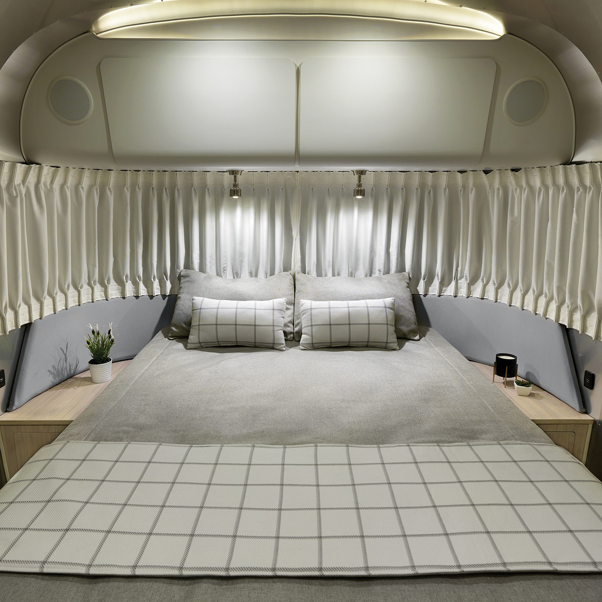 Two nightstands flank the bed and perfectly fit the curves of the Airstream. Each provides perfect storage for small items and books, and the counters are perfect for displaying accessories and charging devices. A TV with an articulating arm lives on the wall at the end of the bed.