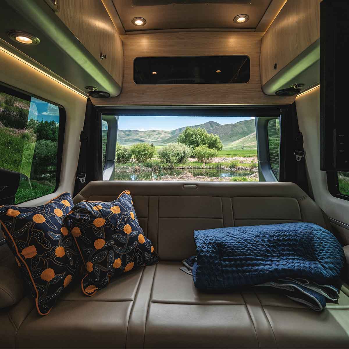 Quickly convert the cockpit of your Mercedes-Benz® camper van into a sleeping space perfect for a small adult, child, or furry friend. The ingenious Luno system features a T-shaped inflatable base that fits snugly between the driver and passenger seats. This creates a firm support upon which the Luno mattress can rest, providing support and comfort for a great night's rest.
