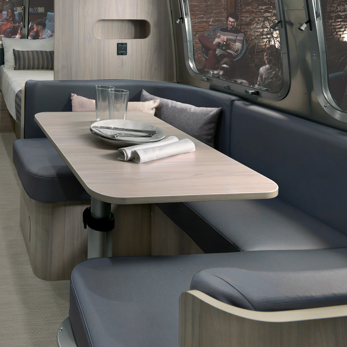 When positioned as a table and seating, the dinette has room for four to eat and socialize, plus a lounging area along the side with a TV on the wall. And when you want some extra sleeping space, it converts easily – with the table acting as a sturdy base and the back cushions sitting on top.